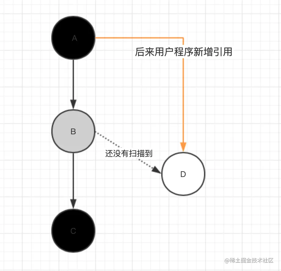 黑色: 表示这个对象的成员变量(引用对象) 都被扫描过,代表这安全存活的对象,当再次被其他对象指向时,不会在进行扫描过程。!!!黑色对象不可能直接越过灰色对象直接指向白色对象,因为黑色对象的所有引用都被扫描过了,不会存在未被扫描的对象。