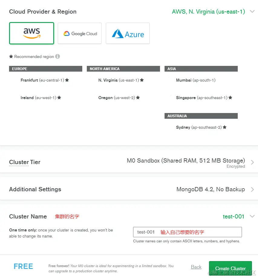 选择 shared clusters 即可,这个是免费的,其他的要收费。