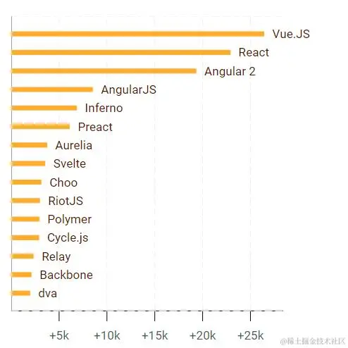 Vue.JS 去年在 Github 上获得了超过25,000 个stars, 这意味着一天72个stars,这比包括React和Angular在内的其他框架都多。