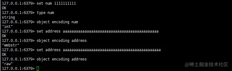 可以发现,当输入纯数字的时候,采用的是 int 编码,而字符串小于等于 44 则为 embstr,大于 44 则为 raw 编码。