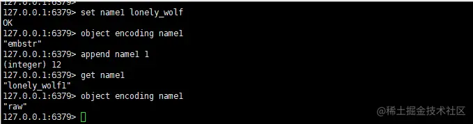 讲了半天理论,接下来让我们一起来验证下这些结论,依次输入 set name lonely_wolf,type name,object encoding name 命令:
