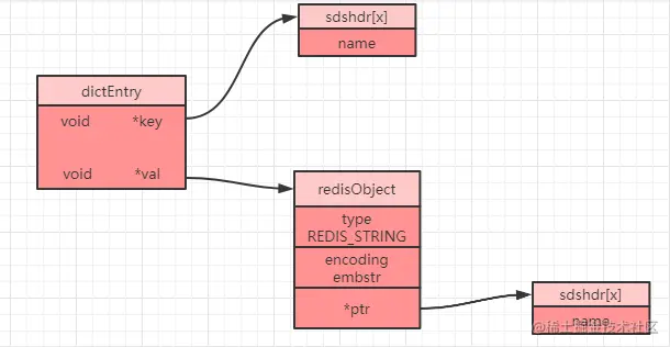 在 Redis 中所有的数据类型都是将对应的数据结构再进行了再一次包装,创建了一个字典对象来存储的,sds也不例外。每次创建一个 key-value 键值对,Redis 都会创建两个对象,一个是键对象,一个是值对象。而且需要注意的是在 Redis 中,值对象并不是直接存储,而是被包装成 redisObject 对象,并同时将键对象和值对象通过 dictEntry 对象进行封装,如下就是一个 dictEntry 对象: