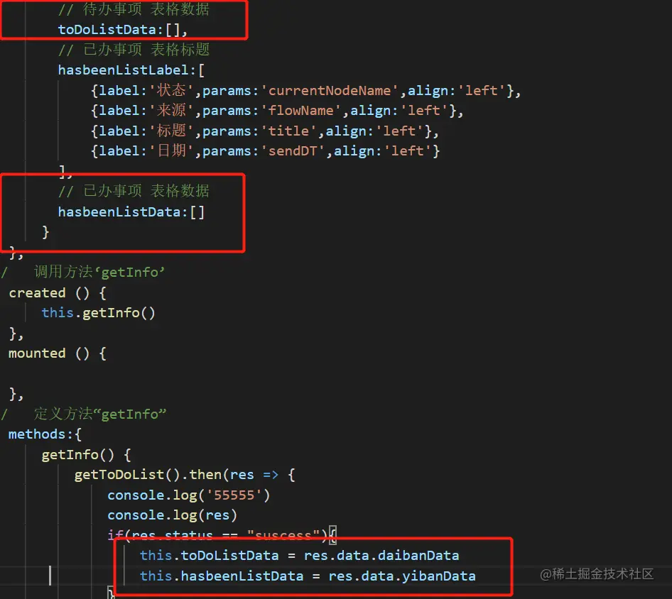 4.当返回的数据状态成功时,让设置的待办和已办表格数据展示为接收到的数据