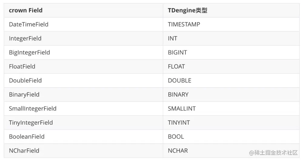 crown支持的字段类型与TDengine字段类型的对应关系: