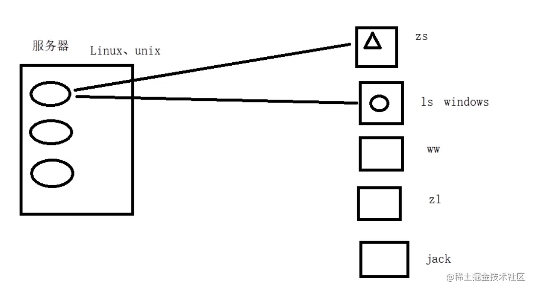 在这种情况下,张三要去访问数据库服务器的时候,他要找到这一台服务器电脑然后操作数据库的服务端吗?这肯定是不行的。其实我们之前讲数据库的时候是不是可以通过在zs的电脑上装一些数据库的客户端,与服务器上面的客户端进行连接,从而来验证一些信息。但是如果说,我们访问的它不是一个数据库的服务,而是一个Linux的服务呢?