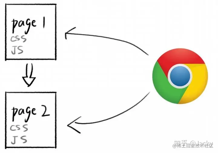 请求完 page2.js 之后,浏览器不需要访问 page2,而是通过 page2.js 将 page1 的内容,转换成 page2