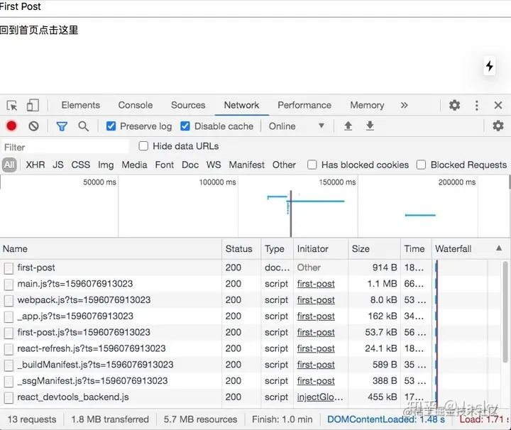 其中第二个请求时 webpack, 所以实际上只发送了一个请求,就是 first-post.js