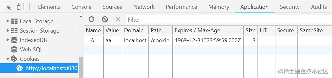 从图中除了看到 Cookie 的名称和内容外,我们还需要关心一个信息,到期时间,到期时间用来指定该 cookie 何时失效。默认为当前浏览器关闭即失效。我们可以手动设定 cookie 的有效时间(通过到期时间计算),通过 setMaxAge(int expiry); 方法设定 cookie 的最大有效时间,以秒为单位。