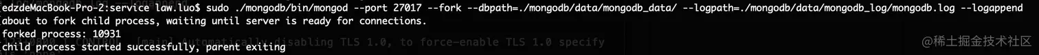 sudo ./mongodb/bin/mongod --port 27017 --fork --dbpath=./mongodb/data/mongodb_data/ --logpath=./mongodb/data/mongodb_log/mongodb.log --logappend
