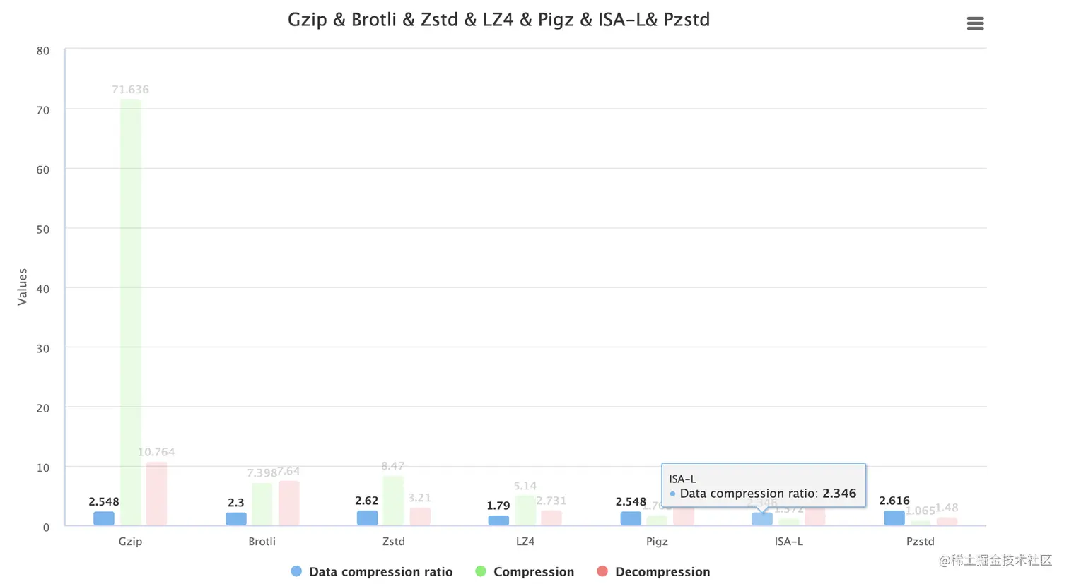 而 ISA-L 的实现在压缩比上有一些牺牲,不过并没有差距很大。