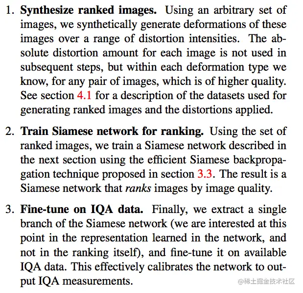 包含三个部分: 1,人工生成不同质量的序列图片; 2,训练孪生网络,使用作者提出的efficient Siamese backpropation technique 3,训练好的孪生网络被认为是可以正确提取图像特征的,然后取出孪生网络的一个胞胎,在标注确切的质量分数的数据集上微调。