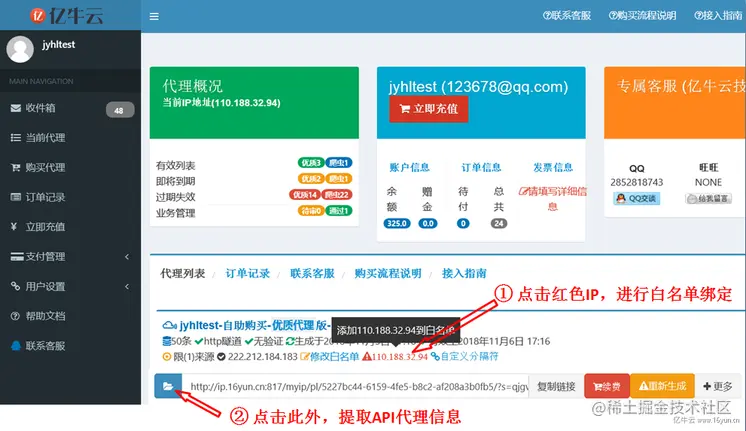 购买的亿牛云优质代理IP,使用和提取的机器IP必须在白名单内,否则无法使用。使用的机器也必须在白名单内IP,否则提取出来也无法使用,会出现超时等情况。