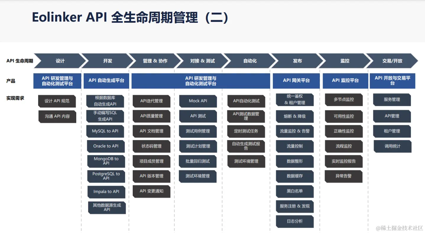 以上简单介绍了API的生命周期几个重要阶段,并使用Eolinker进行演示,API生命周期所涉及的点非常多,若准备对API进行管理,需要考虑到API的各个方面,选好一个API管理平台则有利于更快且更高效的管理API生命周期。 演示工具:www.eolinker.com