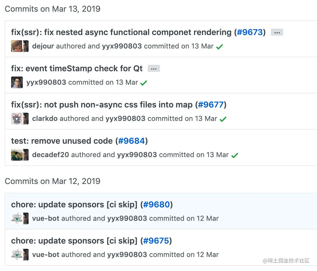 看下 vue.js 仓库的 commits 列表里截一张图,