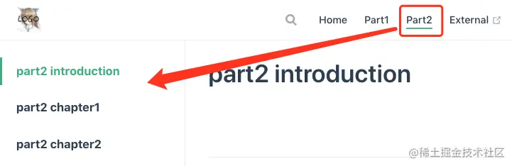 文件结构不变,把 sidebar 改成如下形式,左边栏将分别在 '/part1/' 和 '/part2/' 路径下显示不同的内容。