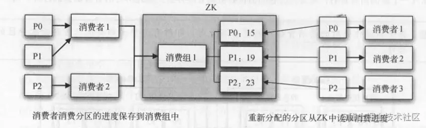 者成员发生变化,也不会影响消息的消费和处理。 如下图所示,消费者消费消息时,需要定时将分区的最新消费进度保存到ZK中 。