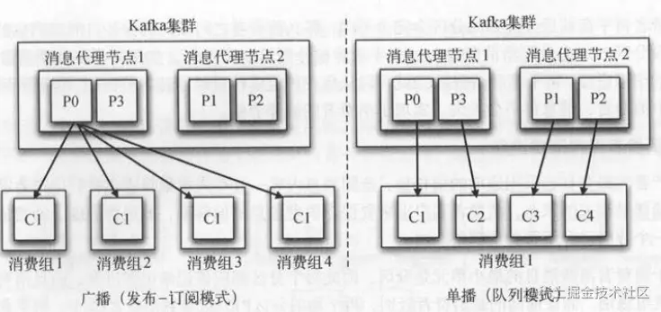 或者各自组成一个消费组(左图)的不同消费场景,这样Kafka也可以实现传统消息队列的发布一订阅模式和队列模式 。