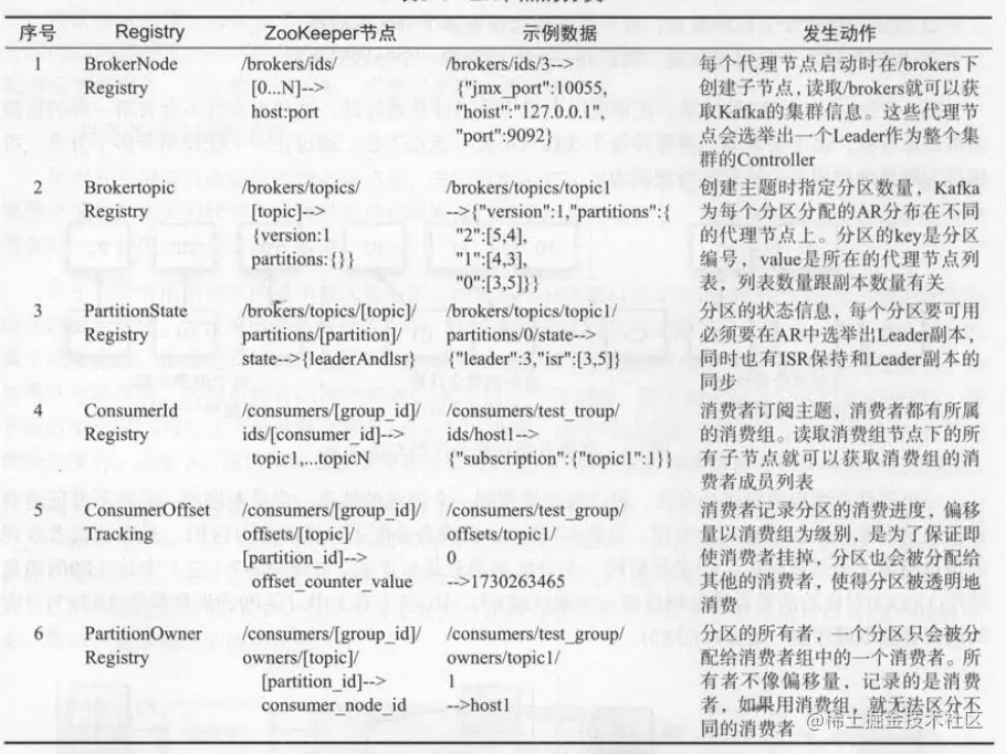 节点、主题 、 分区 、 消费者、偏移量( offset )、所有权( ownership )在ZK中的注册信息 。