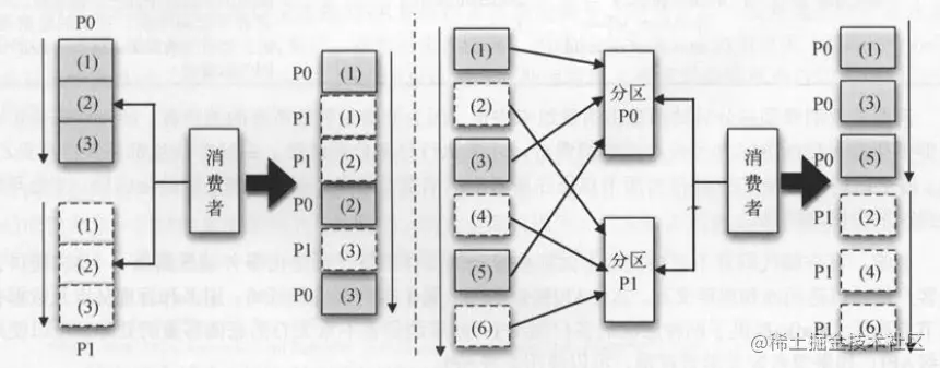 如下图所示,消费者分配了分区P0和分区P1 ,虽然消费者收到的消息整体上不是有序的,但是针对同一个分区的消息是有序的 。