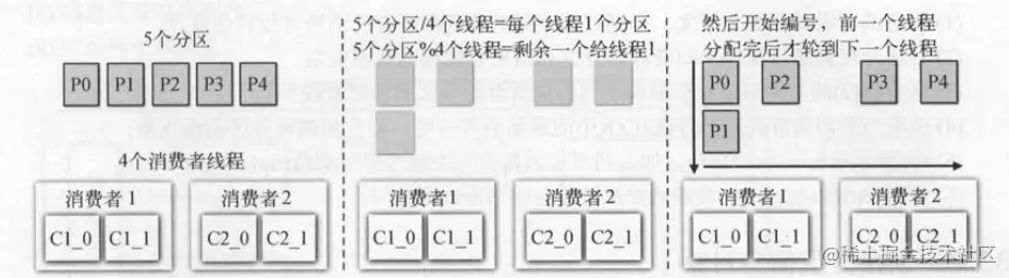 将所有的分区分配给所有消费者的算法为:将分区数除以线程数, 表示每个消费者线程平均可以分到几个分区 。 如****果除不尽 ,剩余的会依次分给前面几个消费者线程。