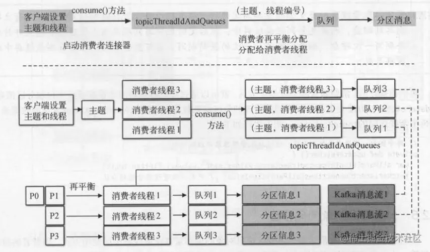 消费者连接器的核心处理逻辑是再平衡操作,它起了承上启下的作用。初始化消费者连接器只是“创建了队列和消息流”,再平衡操作会“为消费者重新分配分区” 。