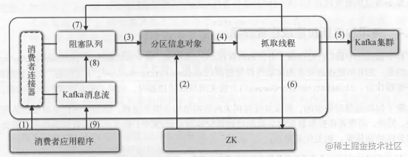 (7)拉取线程将拉取到的消息填充到队列里 。