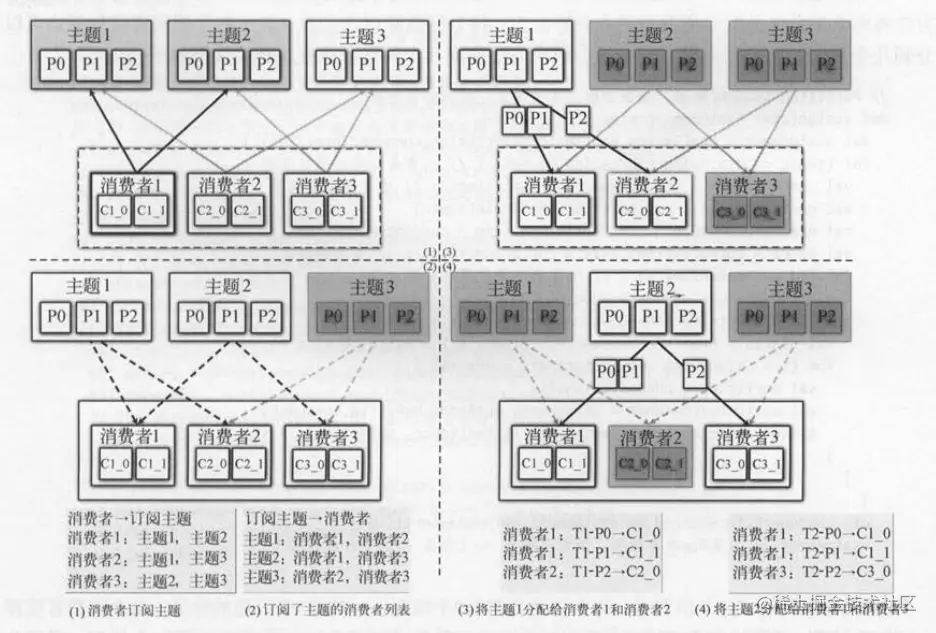 如下图 所示,消费者1订阅了主题1和主题2 ,消费者2订阅了主题1和主题3 ,消费者3订阅了主题2和主题3 。当消费者发生再平衡时,