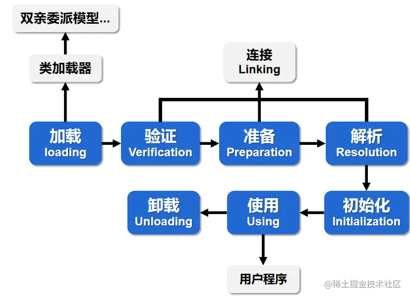 验证,准备,解析三者可被统称为连接 ( Linking ) 阶段;