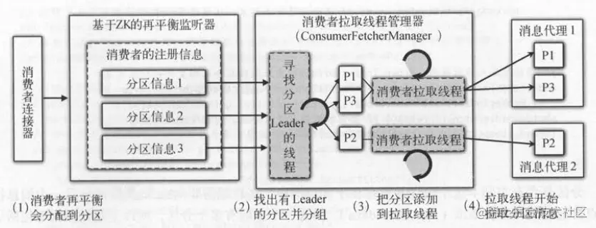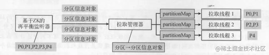 如下图 所示,消费者连接器触发ZKRebalancerListener监听器的再平衡操作,将分区信息传递给拉取管理类,后台线程会选中已经准