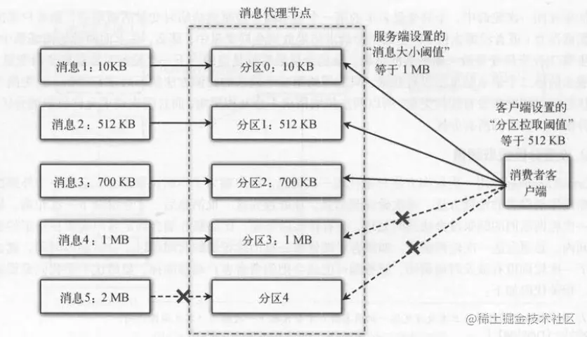 注意,分区拉取阔值必须比消息大小阔值大 。 如下图 所示,假设服务端设置消息大小阈值等于1MB , 表示最大允许接收 1MB的消息 。 如果分区拉取阔值设置为512KB ,