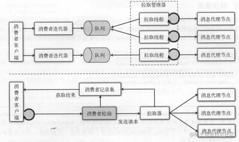 如下图所示,新旧API采用不同的消费者线程模型。 旧API的消费者存在一个拉取管理器管理了所有的拉取线程。拉取线程会不断地从服务端拉取数据,