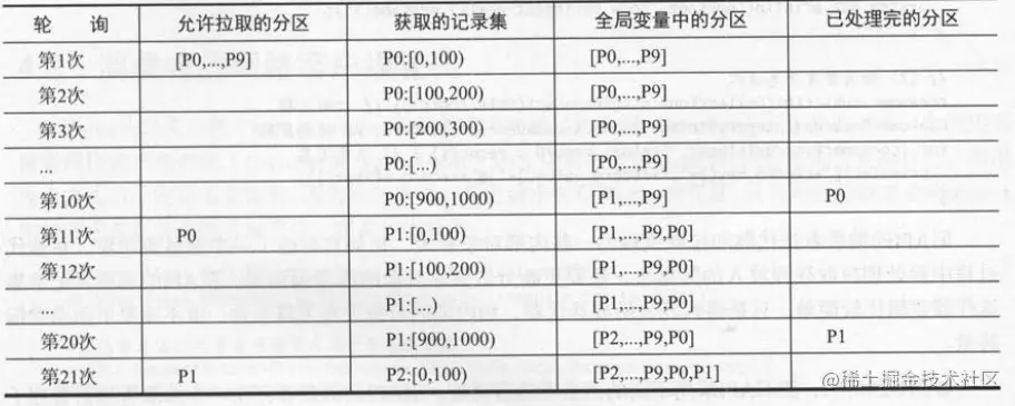 如下表所示,假设“轮询记录阔值”为 100 ,消费者分配了 [P0-P9]共 10个分区,每个分区都有 1000条消息 。 第一次轮询后只会处理分区P0序号为[0-100)