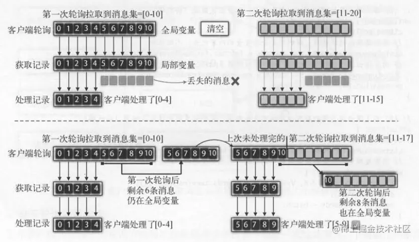 询时拉取到新的消息,也会一起放入全局变量。 并且,我们还能保证上次剩余的消息相较于新拉取的消息会被优先处理