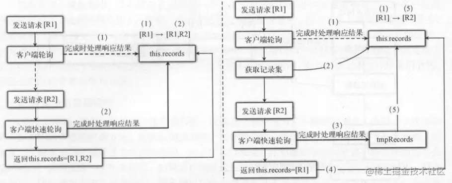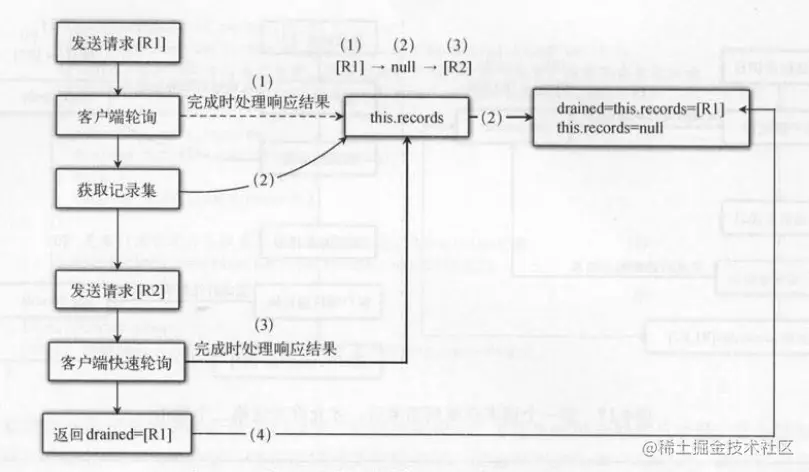 拉取器的 this.records也是个全局变量 , 在客户端的一次轮询里会发送两次拉取请求 。 虽然第二次发送请求后是无阻塞的快速轮询, 但第二次的