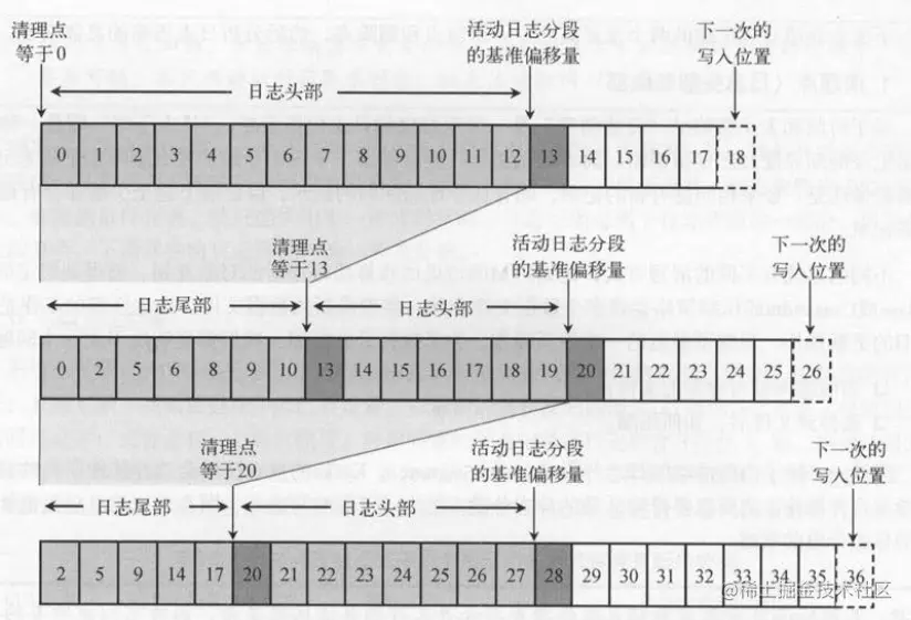 会将日志按照“清理点”( CL****eanerPoint )分成日志尾部和头部 。 如下图 所示,方框中的数字表示偏移量,下面列举了3次日志压缩的步骤。