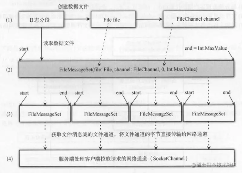 (3)服务端处理客户端的拉取请求,读取日志分段,会读取文件消息集 。