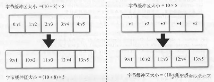 冲区的大小也并不会发生变化。 而如下图 (右)所示,客户端填充消息到 字节缓冲区时没有写入相对偏移量。 服务端存储消息时,
