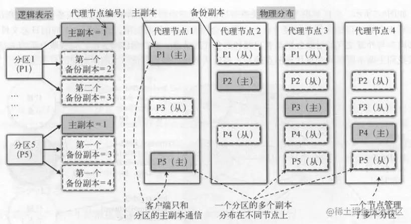 如下图(左)所示,分区从逻辑上分成一个主副本(图中灰色背最)和多个备份副本 。 每个分区都有唯一的分区编号,比如,分区 1用P1表示,分区5用 P5表示 。