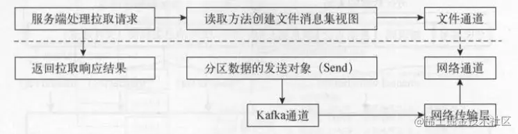发送对象中的数据是读取日志得到的文件消息集视图 。 发送对象和网络传输层的网络通道通过Kafka通道进行关联 。 调用Kafka通道的发送方法 ,