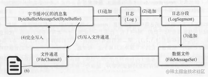 (6) 字节缓冲区写到文件通道中,消息就持久化到日志分段对应的数据文件中了 。