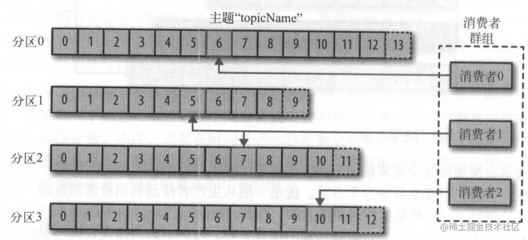消费者是消费者群组的一部分,也就是说,会有一个或多个消费者共同读取一个主题 。 群组保证每个分区只能被一个消费者使用 。如图 所示的群组中,有 3 个消费者同时读取一