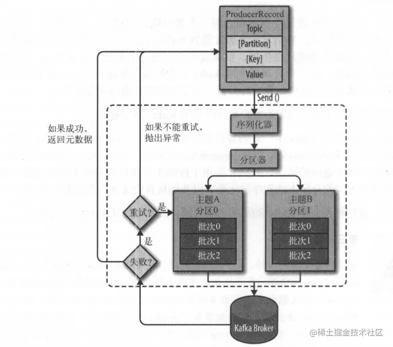 如果消息成功写入 Kafka,就返回 一 个RecordMetaData 对象,它包含了主题和分区信息,以及记录在分区里的偏移量。如果写入失败, 则会返回 一个错误。生产者在收到错误之后会尝试重新发送消息,