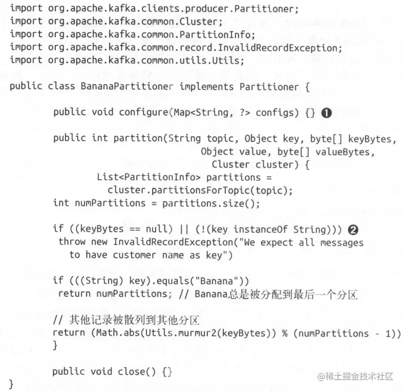 Partitioner接口包含了 conflgure 、 partition 和 close 这 3 个方楼 。 这里我们只实现partition 方法,不过我们真不应该在 partition 方住里硬编码客户的名字 ,而应该通过 configure 方位传进来 。
