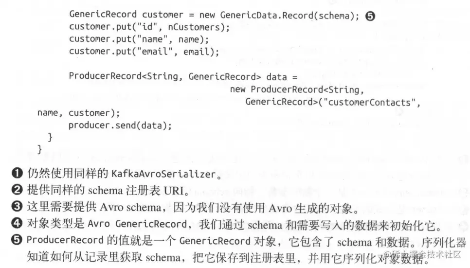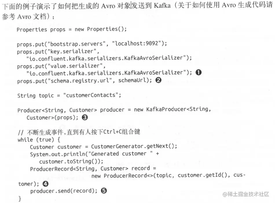 使用 Avro 的 KafkaAvroSerializer来序列化对象。注意 , AvroSerializer 也可以处理原语,这就是我们以后可以使用字符串作为记录键、使用客户对象作为值的原因 。