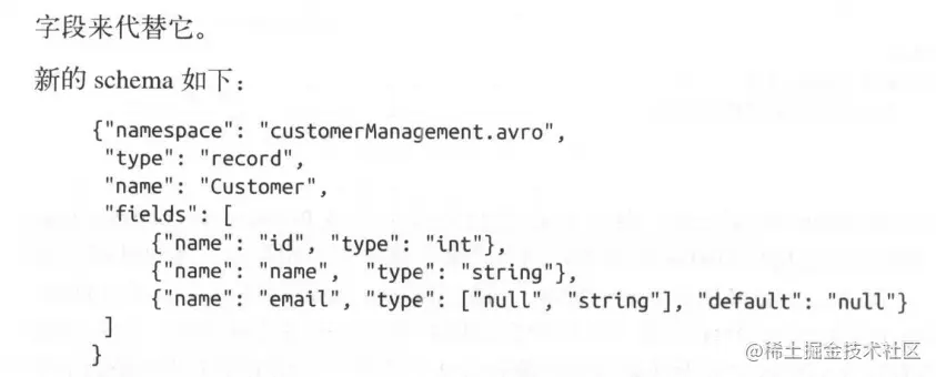 schema, schema 一般会被内嵌在数据文件里。Avro 有一个很有意思的特性是,当负责写消息的应用程序使用了新的 schema ,负责读消息的应用程序可以继续处理消息而无需做任何改动,这个特性使得它特别适合用在像