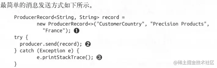 - 生产者的 send () 方住将 ProducerRecord 对象作为参数,所以我们 要先创建 一 个ProducerRecord 对象。 它需要目标主题的名字和要发送的键和值对象,它们都是字符串。键和值对象的类型必须与序列化器和生产者对象相匹配。