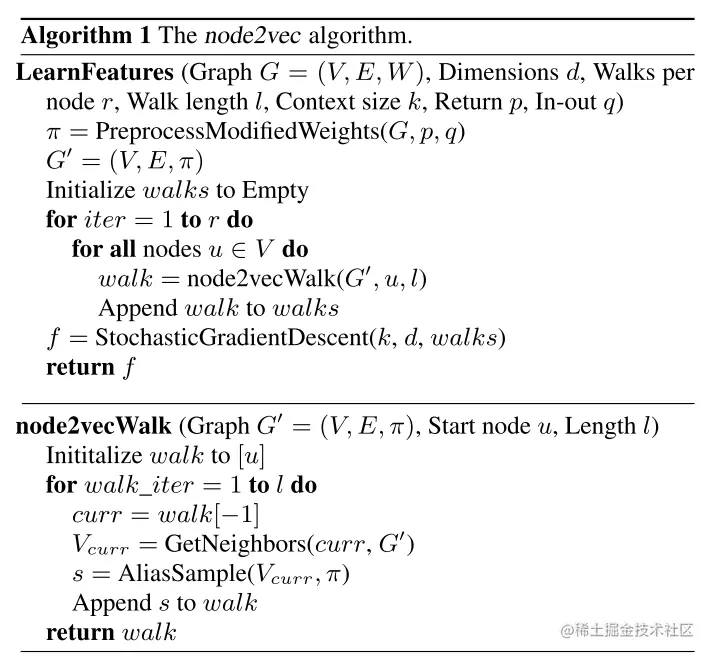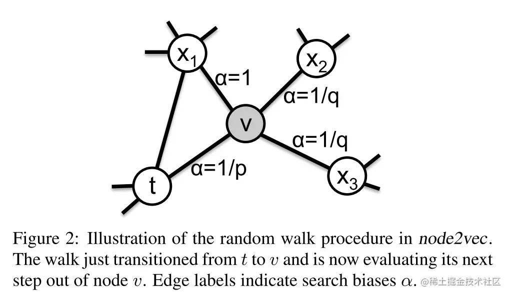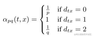 并且定义了一个概率分布,表示一个结点到不同的邻居的转移概率,p表示的是返回概率,q表示的是出入概率。当p、q均为1的时候,游走的方式等同于DeepWalk中的随机游走。