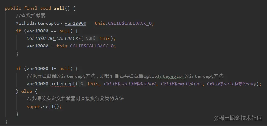 与预期一致,通过Inteceptor类成功实现了sell()方法的前后增强功能。但是前面也提到了Cglib是通过集成来实现代理的,在测试类中,我们加入了一段static静态代码块,目的是将Cglib在运行过程中生成的代理类写入硬盘。