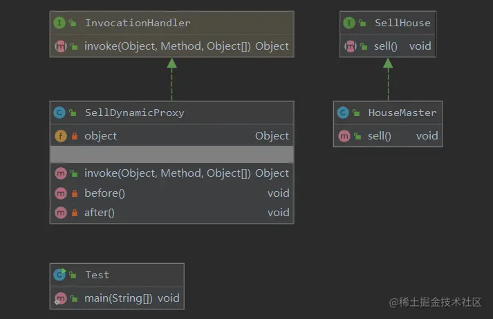 在案例中,SellHouse为接口,定义销售房屋方法,而HouseMaster则为销售房屋的房主,SellProxy为销售代理,由销售代理对房主的销售进行代理并增强。