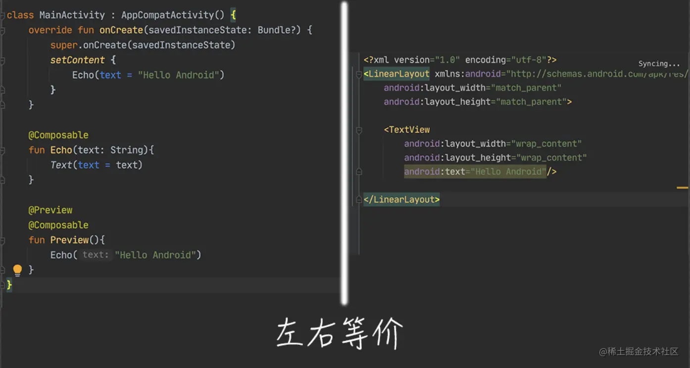Compose 是一种全新的 UI 开发方式,用于取代 xml 搭建 View 层级的方式。先来看一个 Hello World 的代码对比: